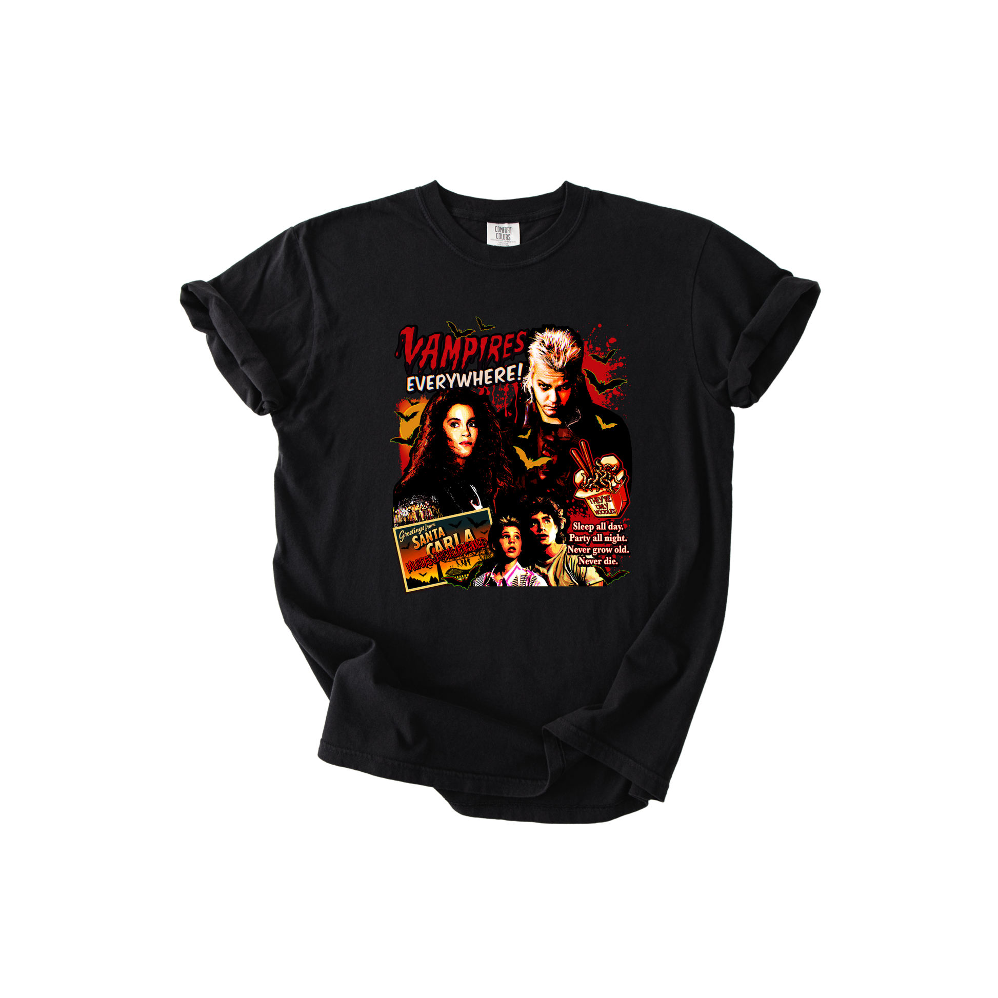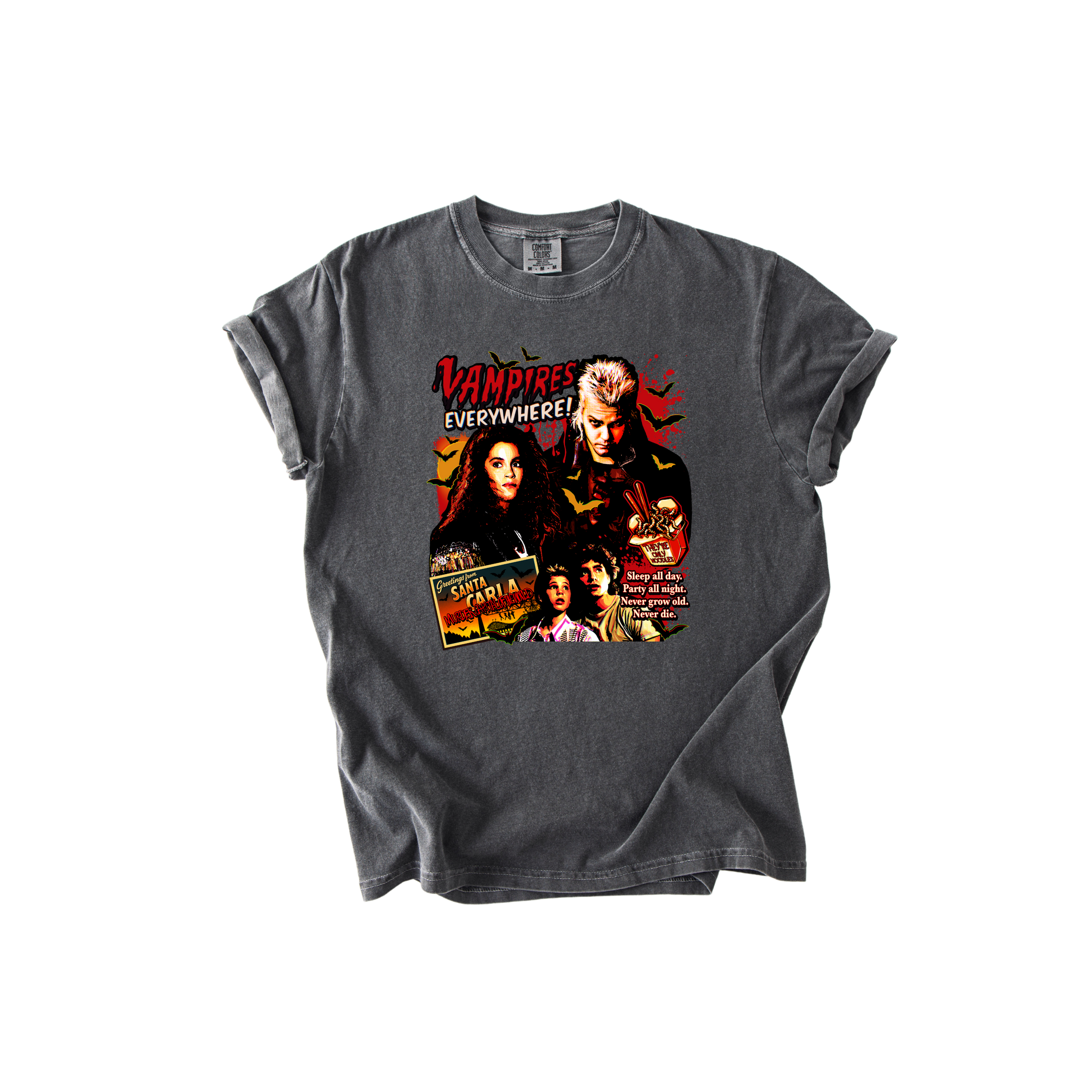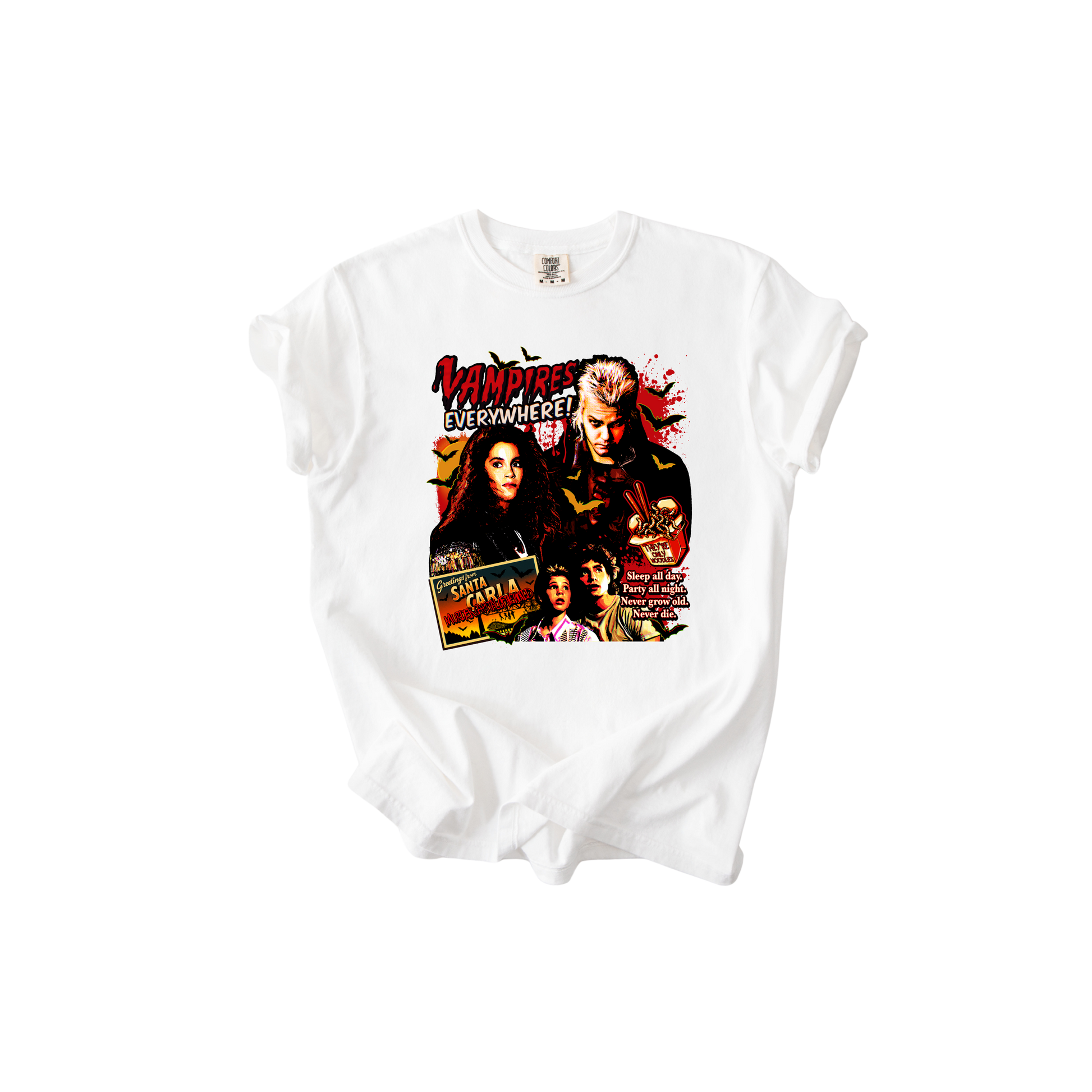 Sleep all day, party all night, never grow old, never die. The Lost Boys cult classic vibes reimagined. Perfect for true vampire believers.